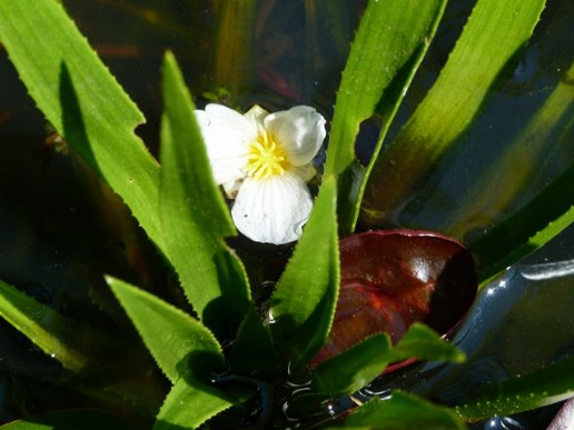 L’ananas d’eau ou plante, plus connue sous le nom de faux aloès, est une plante d'entre deux eaux. Elle ne remonte à la surface que pour la pollinisation des fleurs, d’un blanc pur au cœur jaune de juin à août. Son feuillage est raide, bord dentelé, de couleur pourpre au début du printemps, puis vert soutenu par la suite. Très belle plante originale, elle est filtrante et oxygénante. L’hiver, elle redescend au fond de l’eau pour s’abriter du froid. Appelée chardon d’eau dans la région de st Omer.