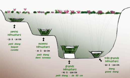 Le principal critère à prendre en compte lors du choix du nénuphar, en dehors de l'esthétique, est la profondeur de plantation. Elle représente la distance entre la surface de l'eau et la surface du substrat dans lequel est planté le rhizome.